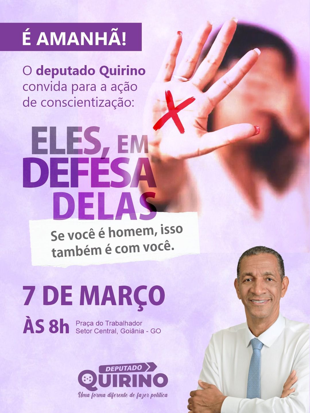 Acontece amanhã, sexta-feira (7), em Goiânia, uma ação de conscientização voltada ao combate à violência contra a mulher. A iniciativa é promovida pelo deputado estadual Quirino e busca mobilizar a sociedade para a importância da prevenção e do enfrentamento desse tipo de crime.