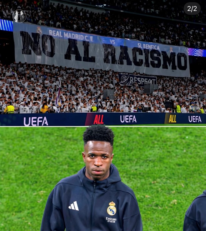 Torcedores do Real Madrid exibiram uma faixa gigante contra o racismo em apoio ao atacante Vinícius Júnior antes do confronto contra o Benfica.