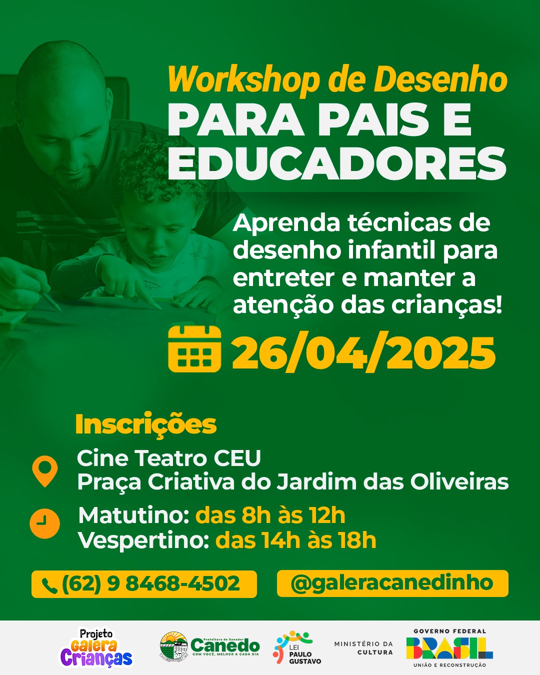 O Workshop é um projeto contemplado pela Lei Paulo Gustavo, com o objetivo de ajudar pais e educadores a entreterem crianças, através de técnicas simples de desenho, além de despertar a criatividade e fortalecer a relação entre os pequenos.